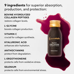 Water; Hydrolized Bovine Collagen, L-glycine; Sweetener: Xylitol; Blueberry (Vaccinium Corymbosum L., Fructus) Juice Powder, Glucosamine Sulphate, Black Currant (Ribes Nigrum L. Fructus) D.e. Tit. In 25% Anthocyanins, Blueberry (Vaccinium Corymbosum L., Fructus) D.e. Tit. In 25% Anthocyanins, Vitamin C (L-ascorbic Acid), Hyaluronic Acid (1250 Kda); Preservative Agent: Potassium Sorbate; Flavour: Berries; Vitamin B2 (Riboflavin), Vitamin B6 (Pyridoxal-5-phosphate), L-ergothioneine, Selenium (L-selenomethionine).